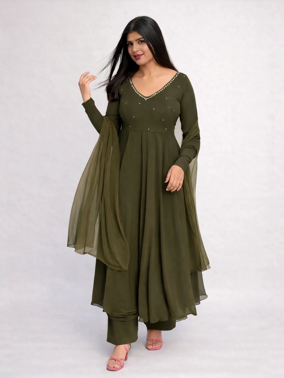 Women's Olive Green Embellished Georgette Anarkali Suit Set